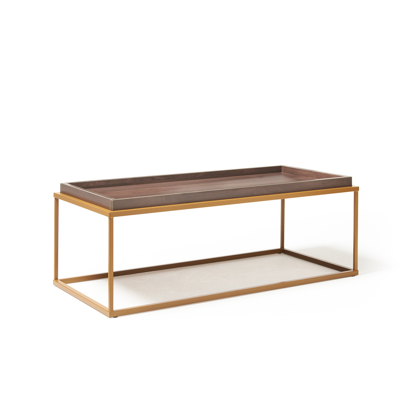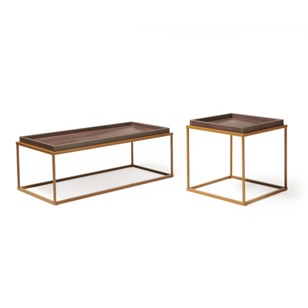 Parma large rectangular coffee table 1100mm x 500mm bring a modern twist to a traditional design. The steel box section frame is finished a gold matt paint while to tray top design is finished in executive wood finish.